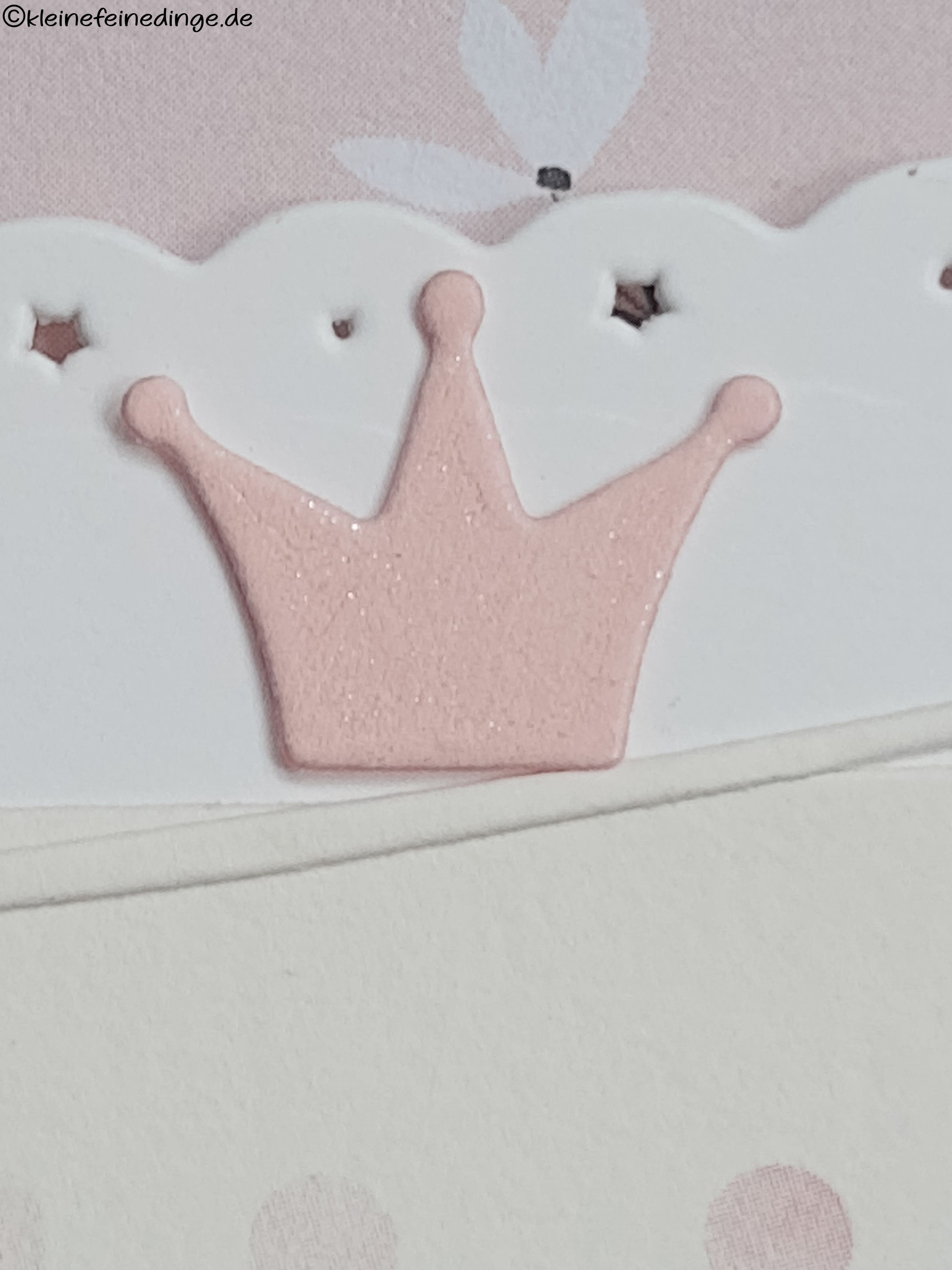 · Im Mittelpunkt steht ein dekorativer Rahmen in edler Ausstanz‑Optik, ergänzt durch eine kleine rosafarbene Krone mit sanftem Glanz.