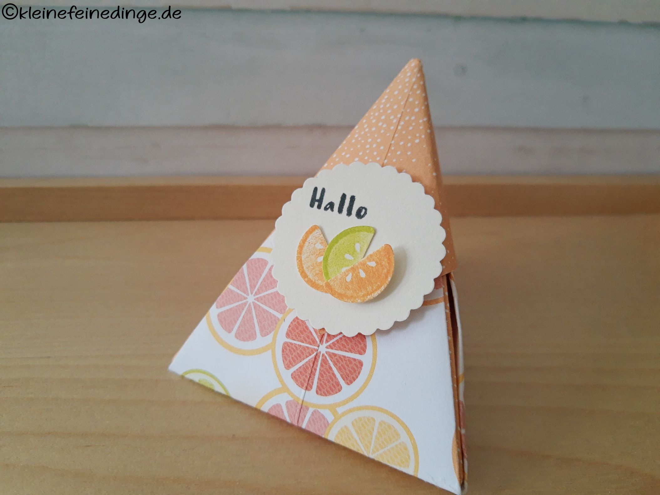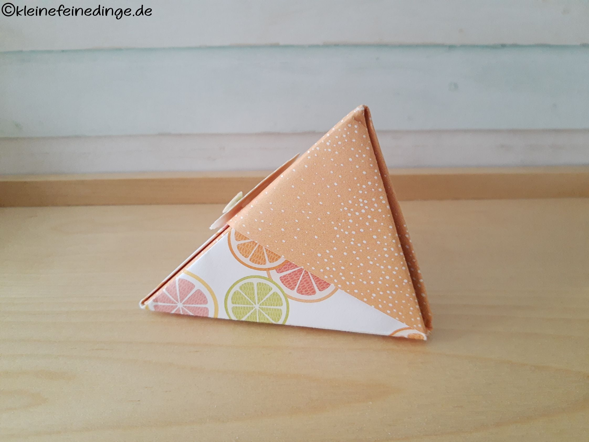 Diese liebevoll gestaltete Mini‑Schachtel ist ein echter Hingucker! Mit ihrem frischen Zitrus-Design und der raffinierten pyramidenförmigen Optik eignet sie sich ideal als kleine Geschenkverpackung für besondere Momente – ob für Gäste, Freunde, Kollegen oder als hübsches Extra zu einem größeren Geschenk.