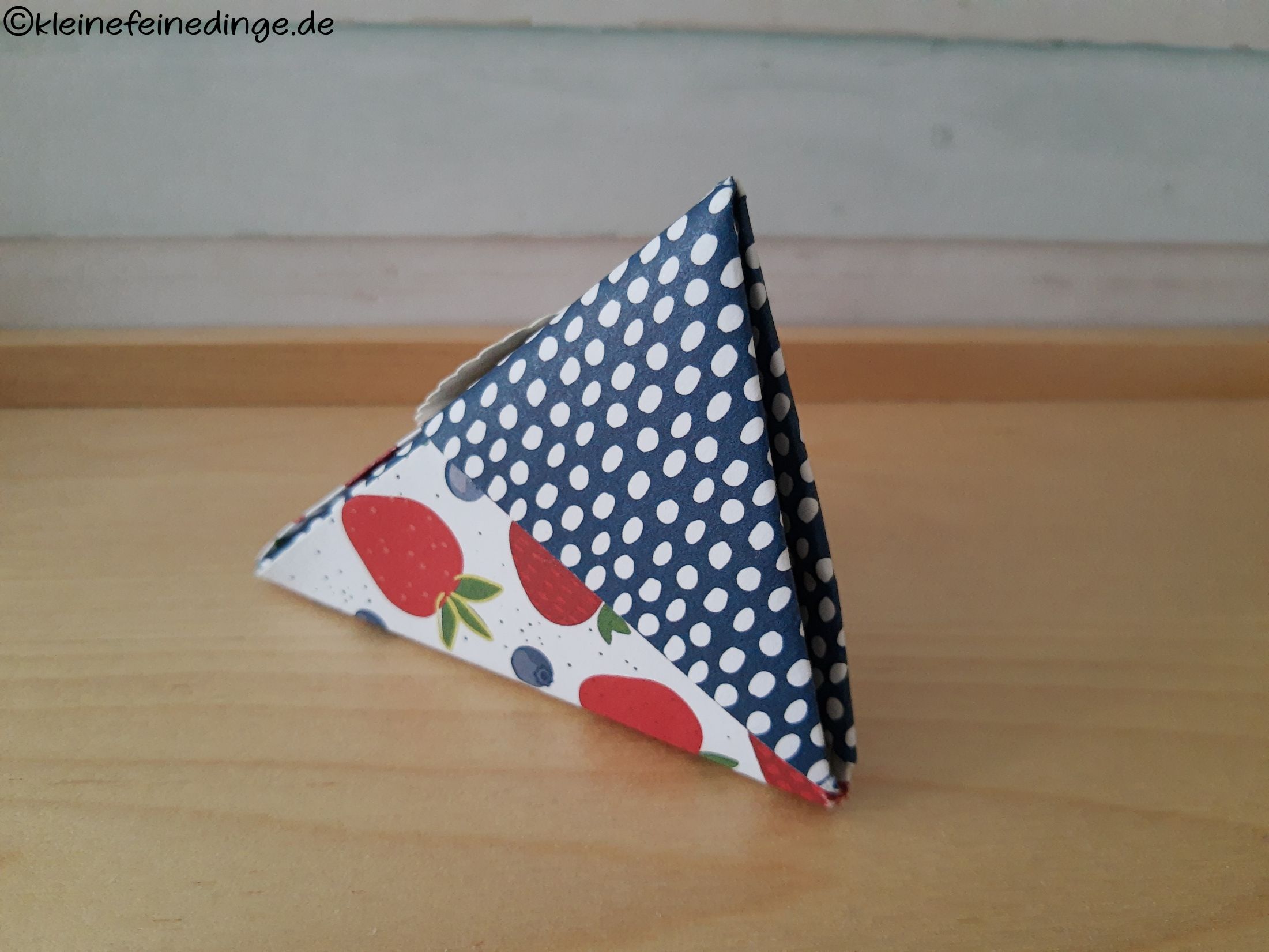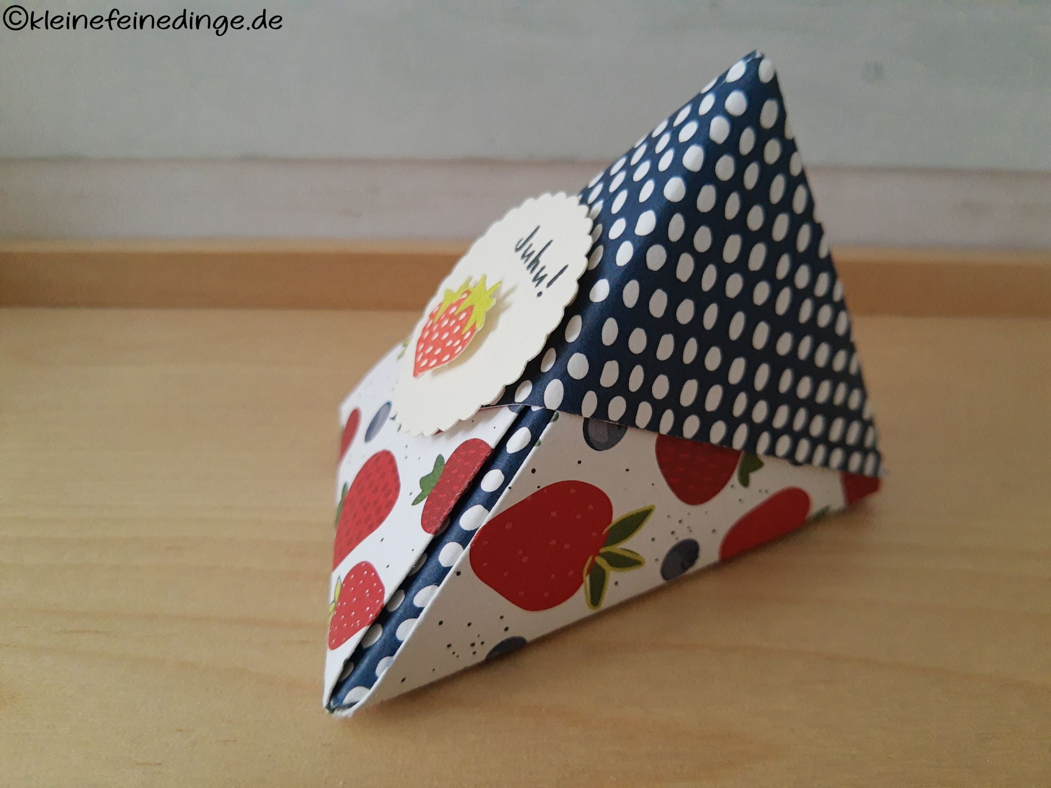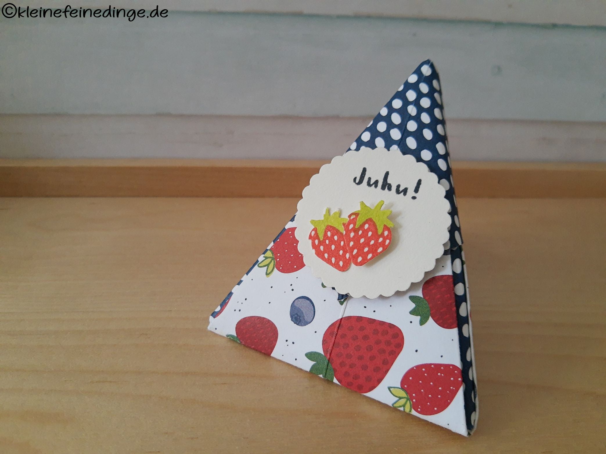 Diese fröhliche Dreiecksschachtel ist der Beweis: Gute Laune gibt es tatsächlich im Mini-Format! Mit ihrem Mix aus sommerlichen Erdbeeren, frechen Punkten und einem fröhlichen „Juhu!“ zaubert sie schon beim Überreichen ein breites Grinsen ins Gesicht – und das ganz ohne Stromverbrauch.
