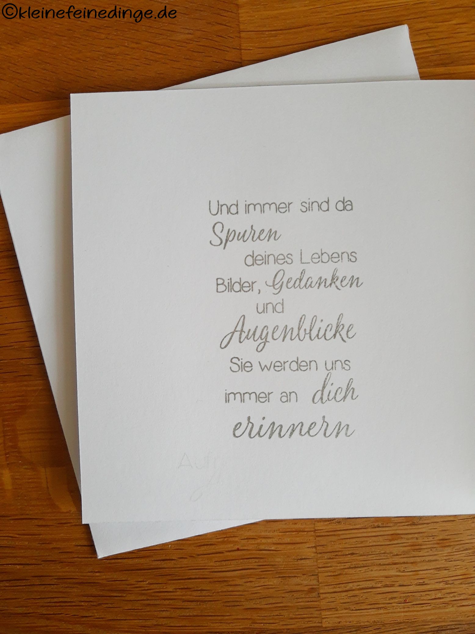- Im Inneren: Gestempelter Trauerspruch in ruhiger, klarer Typografie